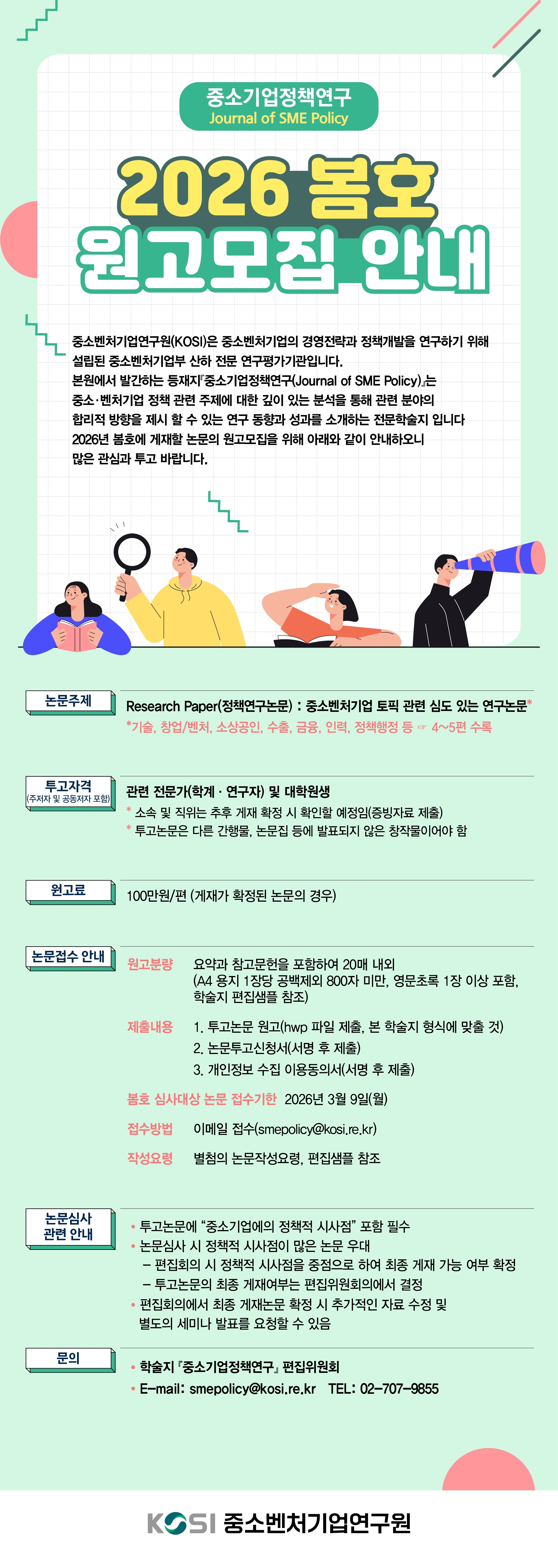 등재학술지『중소기업정책연구(Journal of SME Policy)』2026년 봄호 논문 모집 홍보 협조 요청