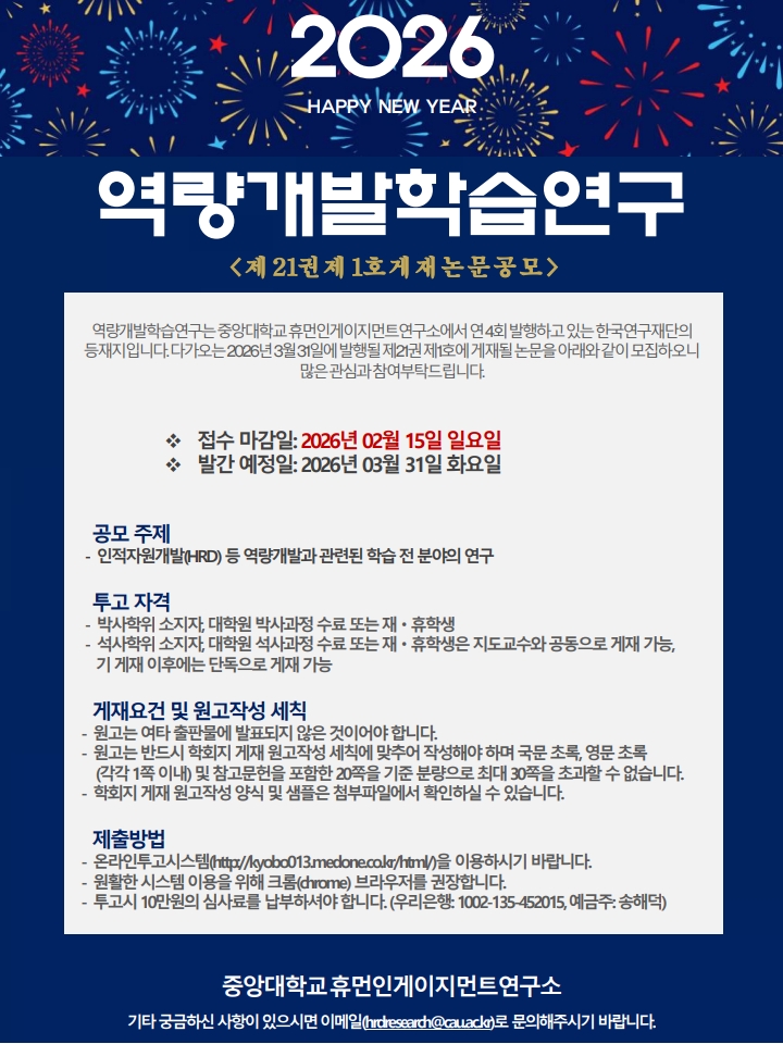 | 2026년 중앙대학교 Human Engagement Institute 등재지『Journal of Competency Development & Learning』논문공모 안내(제21권 제1호) | |||||