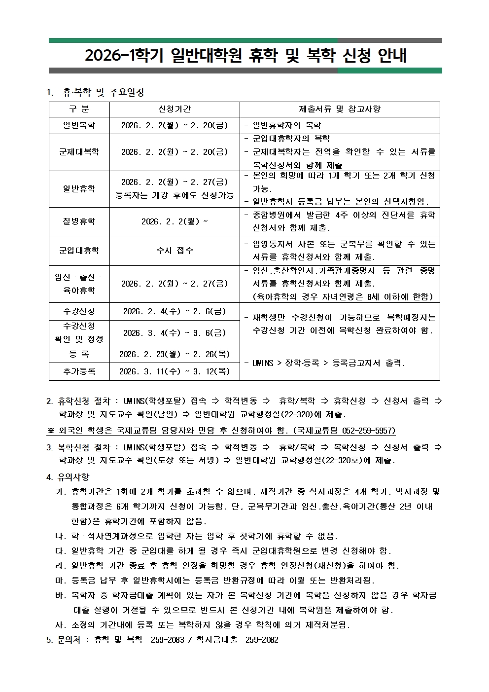 2026-1학기 일반대학원 휴학 및 복학 신청 안내