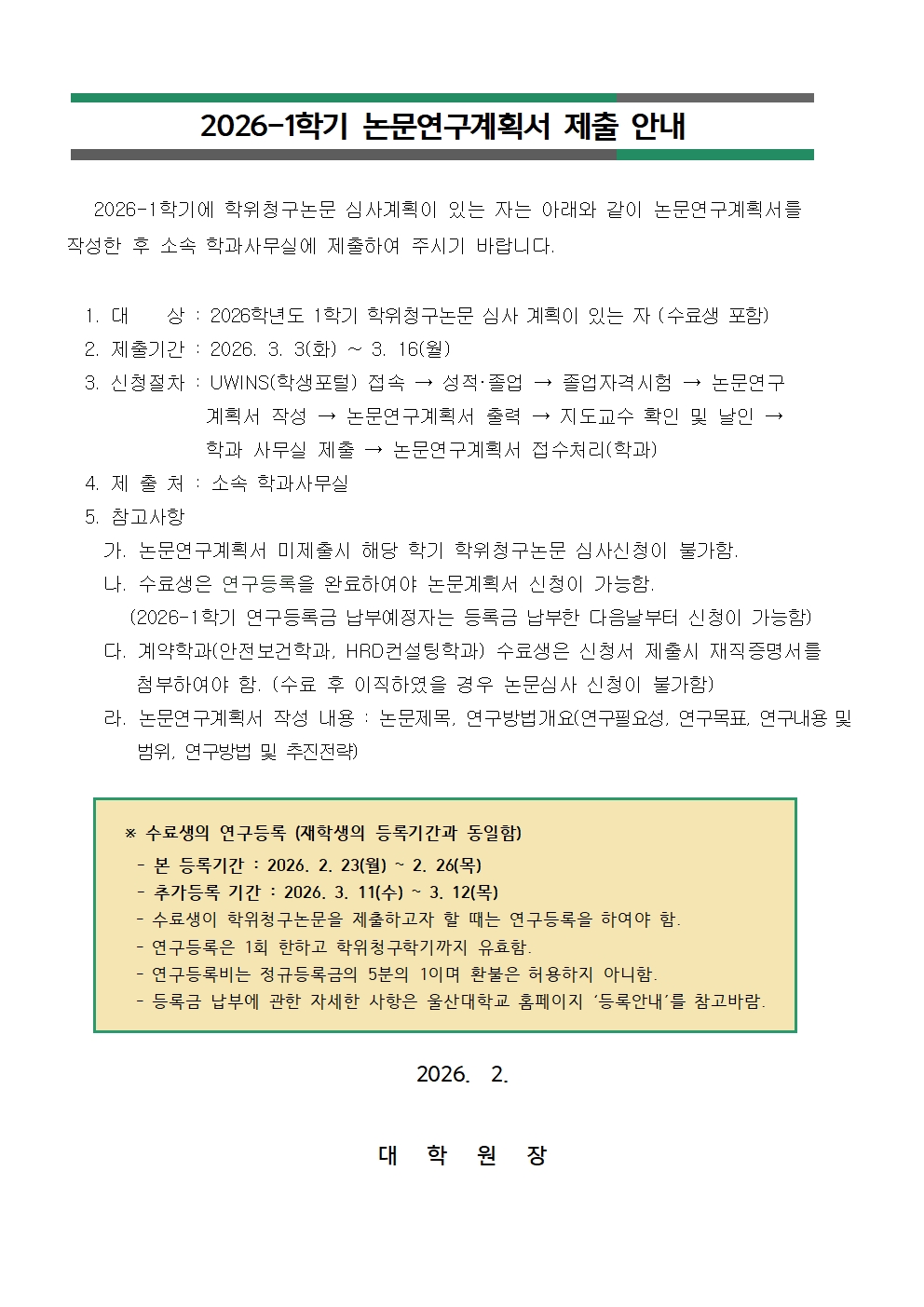 2026-1학기 논문연구계획서 제출 안내