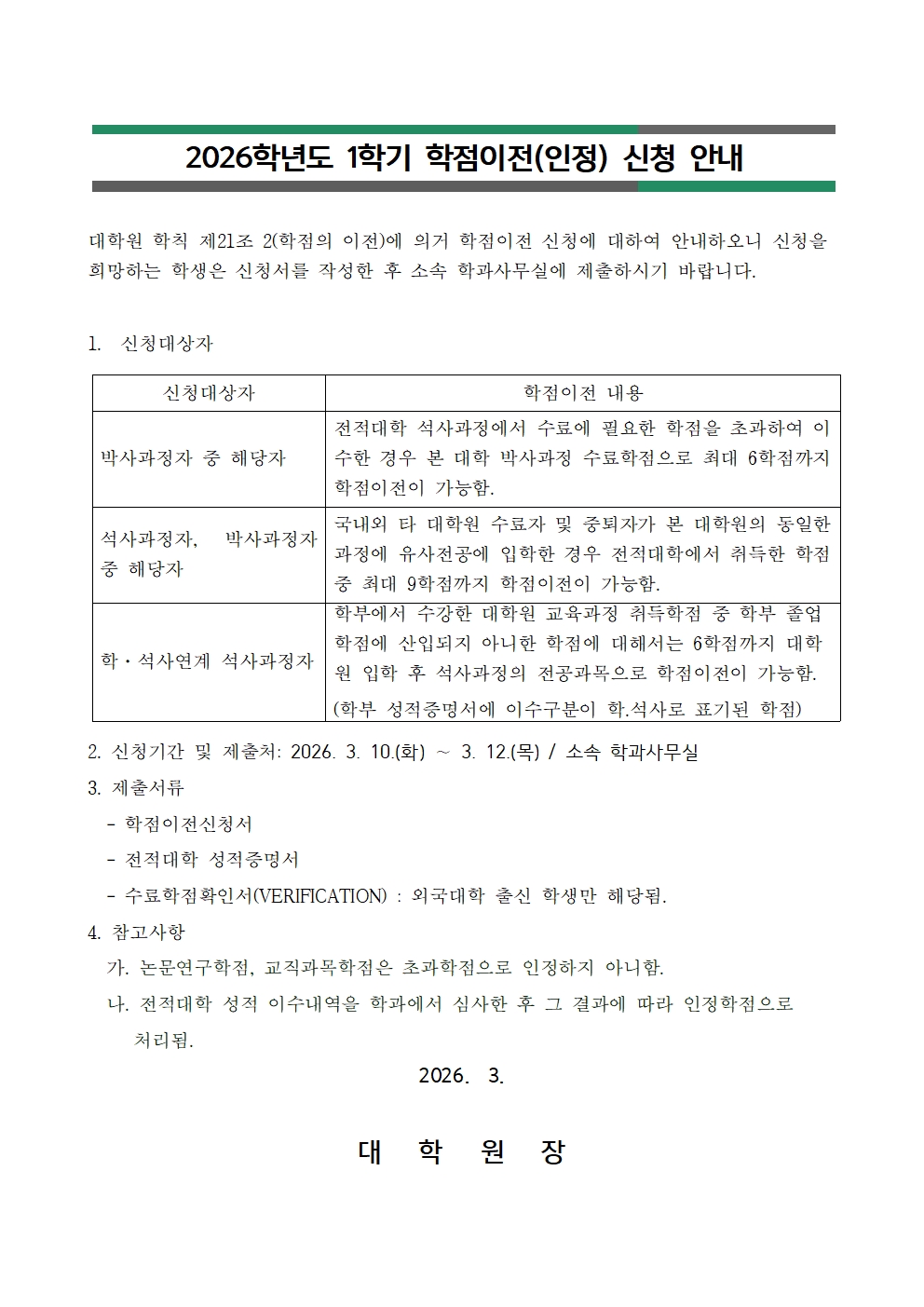 2026-1학기 학점이전(인정) 신청 안내