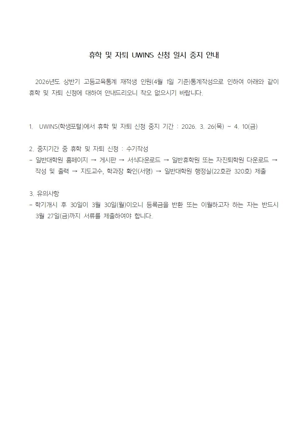 휴학 및 자퇴 UWINS 신청 일시 중지 안내